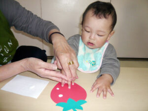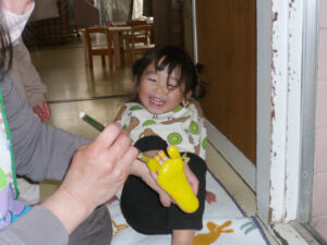 足型に絵の具をつけるとくすぐったくてみんな大笑いしながら楽しんでいました