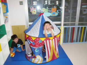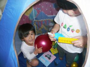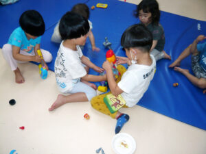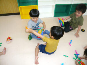 ボールハウスは大人気!🥎 2022/06/20 ボールハウスは大人気! みんなで順番に入って 遊んでいます。 手先が器用器用な子どもたち。 工具遊びでは自分で考えてロボットなどを作り、 見せあいっこをしています。