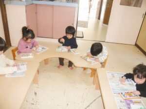 好きな色のクレヨンを手に取り大好きなお絵かきをする1歳児、0歳児さんです。