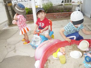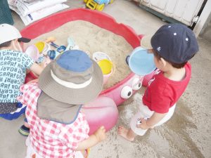 園庭にゴムのプールを出して、砂場を作りました。