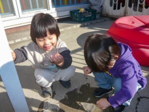 寒いさむい冬の朝⛄ 2023/02/05 大きな氷ができた日に、お外で氷を触ってみました。 「冷たい~」「おもたい」と子どもたちは氷の感触を楽しみました。 寒い日が続きますが子どもたちは元気いっぱいです。